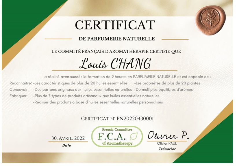 可獲頒法國F.C.A. 精油調香師入門級證書與韓國KDCA精油調香師入門級證書