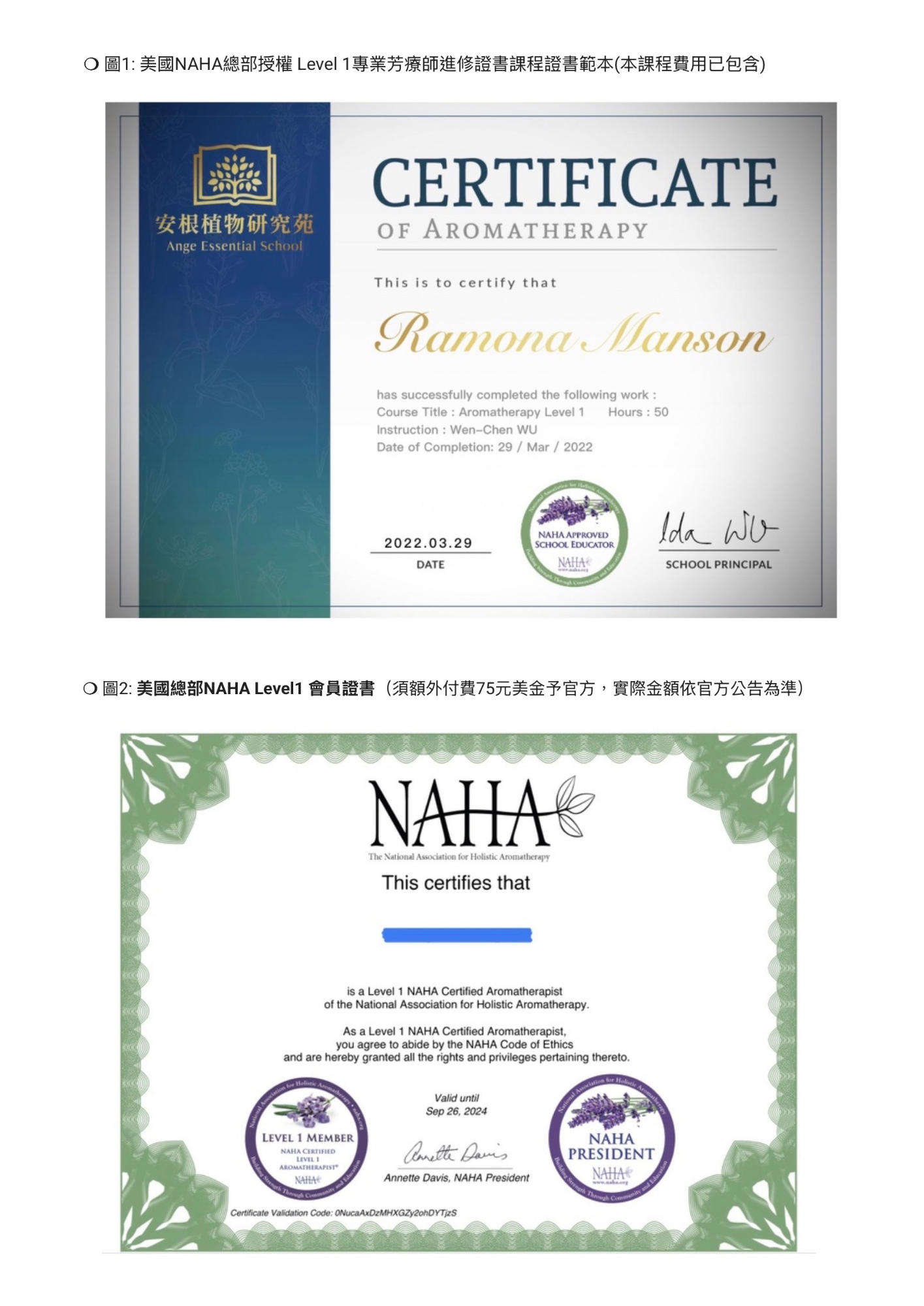 - 專業進修證書:完成作業並通過測驗者,將頒發 美國 NAHA 總部授權 Level 1 專業芳療師進修證書。 (證書樣式參考上圖 1)